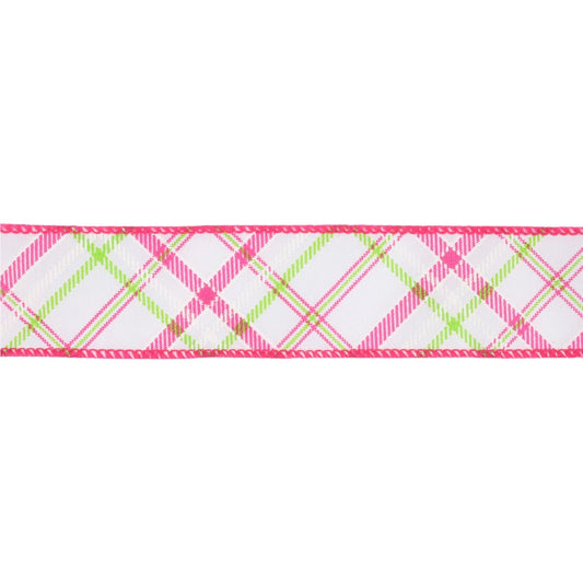1 1/2" Wired Ribbon | White w/ Pastel Pink and Green Bias Plaid | 10 Yard Roll